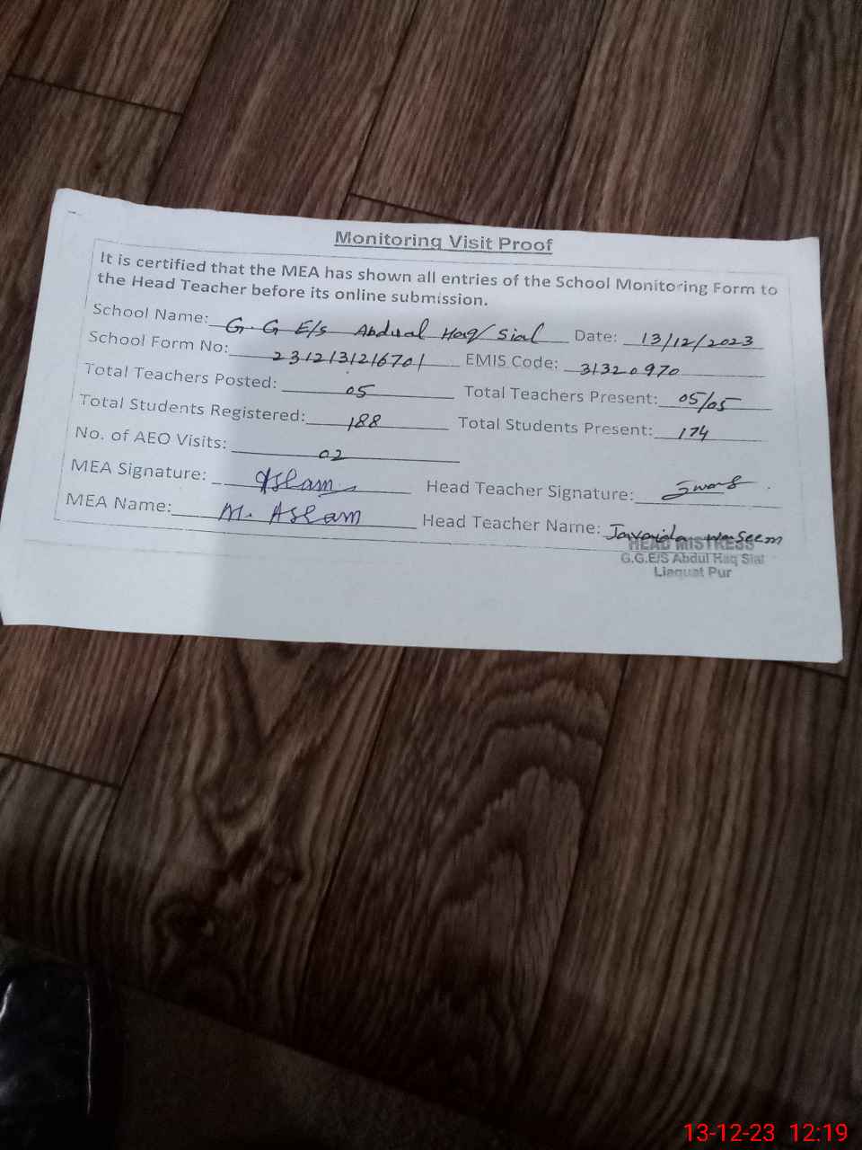 | EMIS Code: 31320970 | Name of School: GGES ABDUL HAQ SIAL | |||