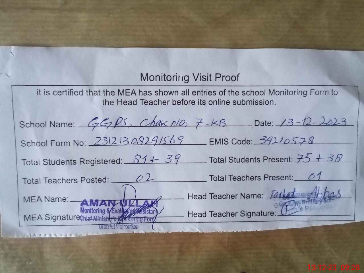 | EMIS Code: 39210578 | Name of School: GGPS CHAK NO. 7 KB | |||