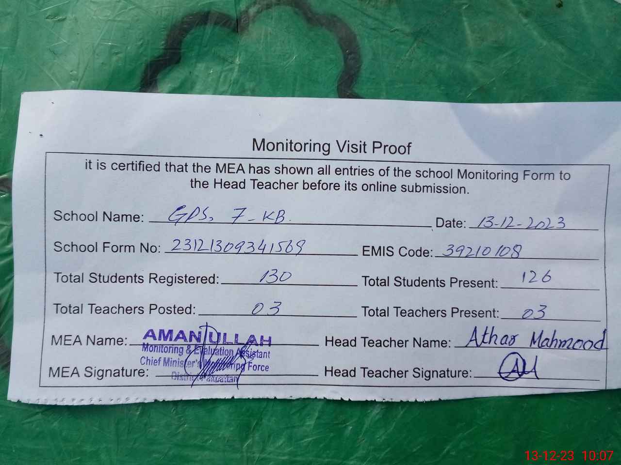 | Attendance Register | Head Teacher | MEA with School | Visit Proof |