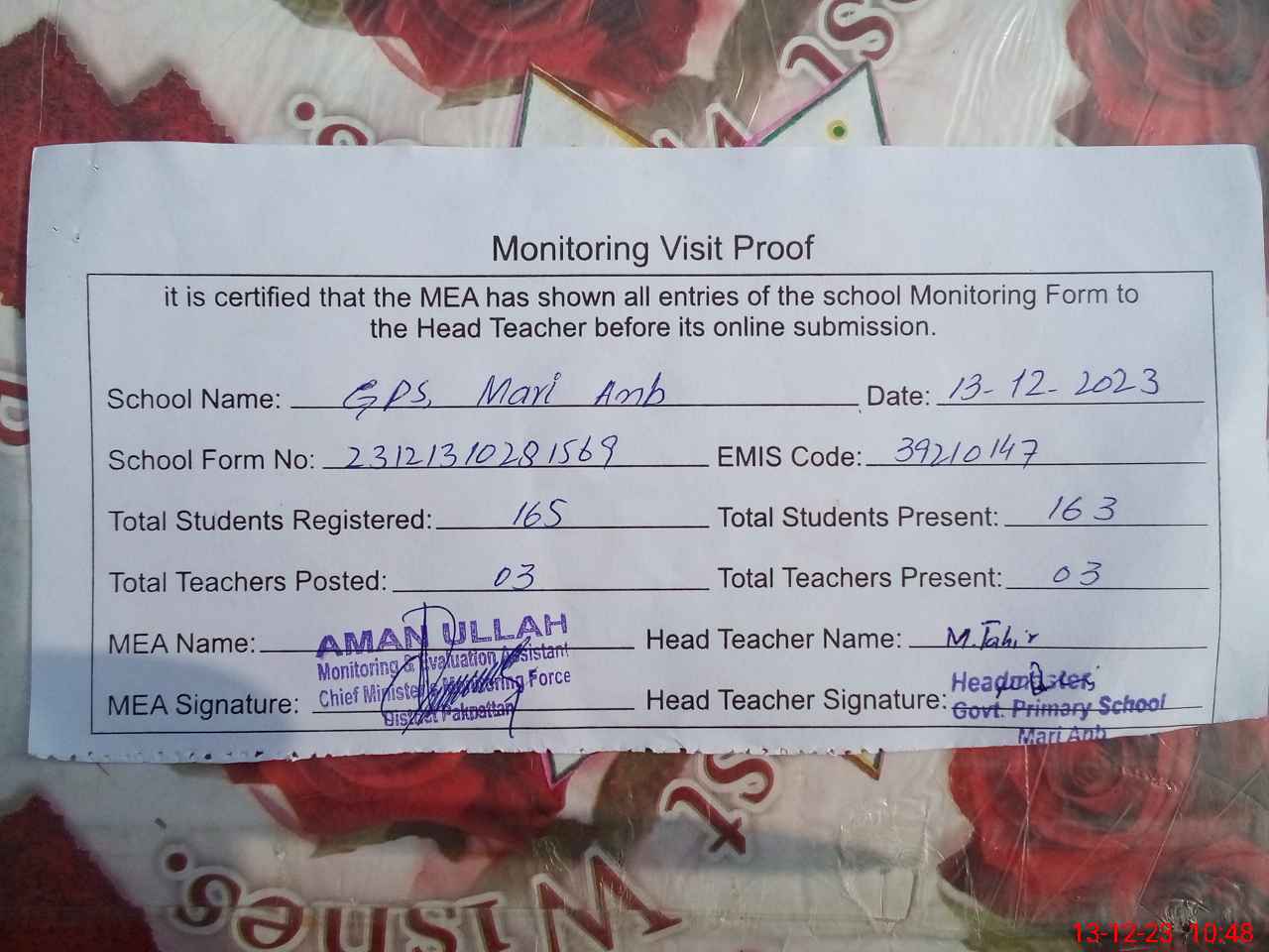 | Attendance Register | Head Teacher | MEA with School | Visit Proof |