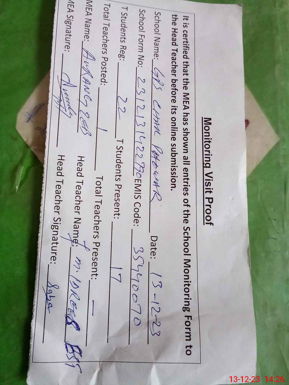 | Attendance Register | Head Teacher | MEA with School | Visit Proof |