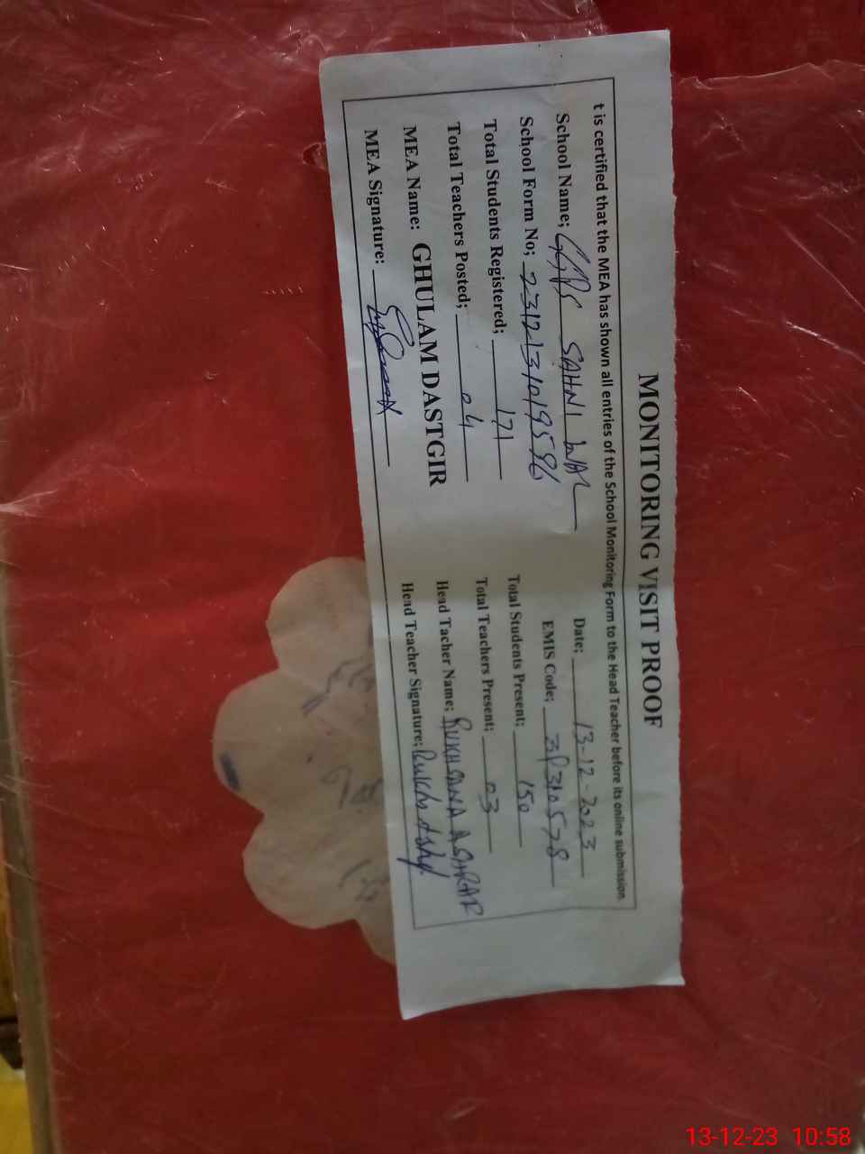 | Attendance Register | Head Teacher | MEA with School | Visit Proof |