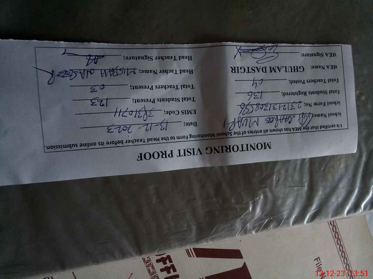 | Attendance Register | Head Teacher | MEA with School | Visit Proof |