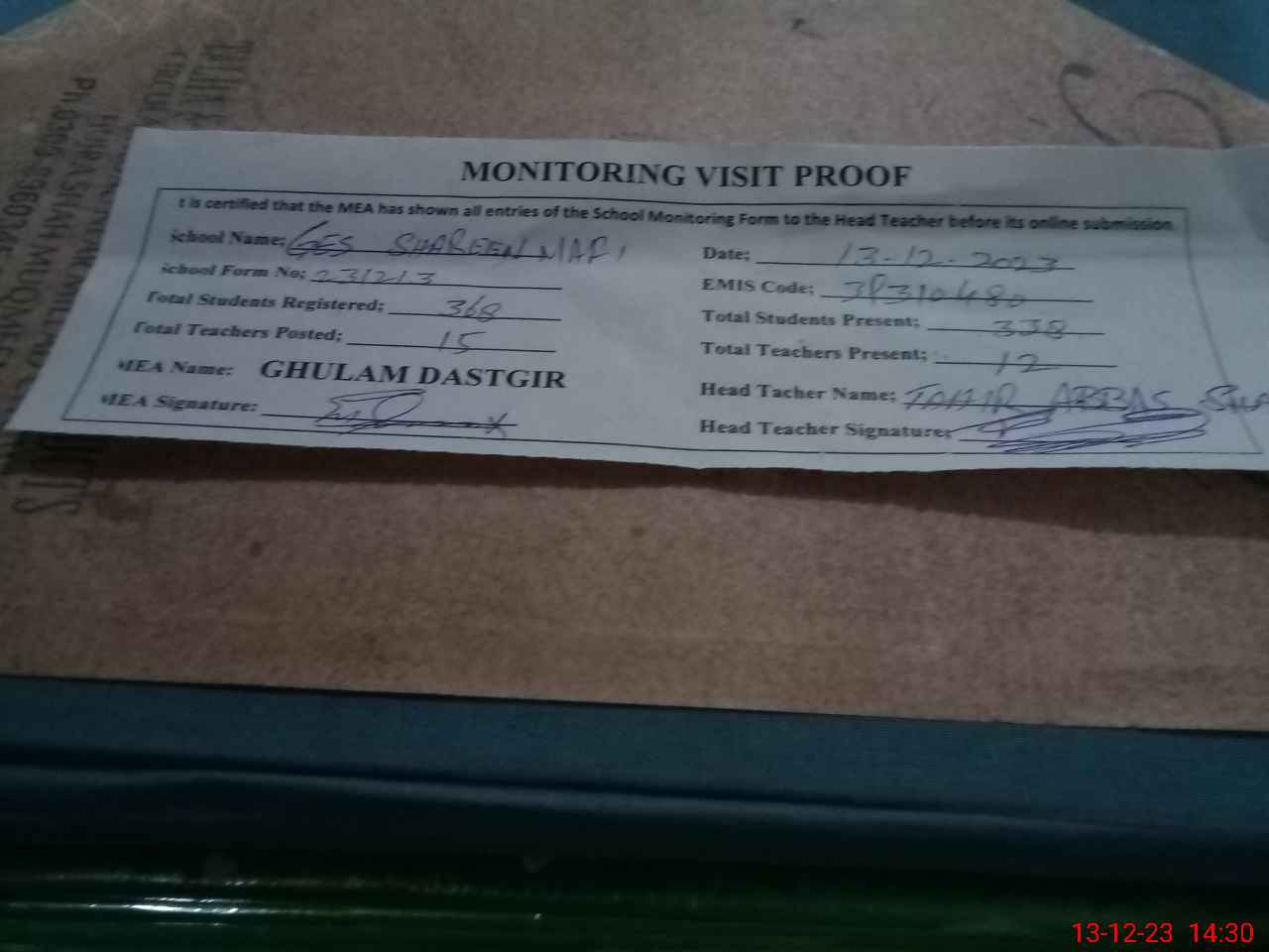 | Attendance Register | Head Teacher | MEA with School | Visit Proof |
