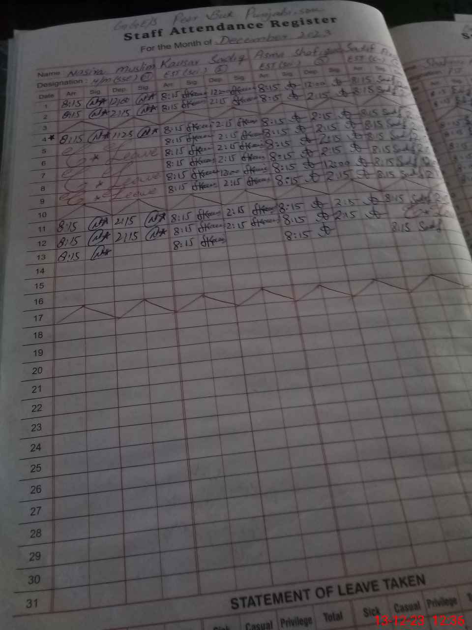 | CNIC | Full Name | Designation | R/C | Absence During Last Calender Month |