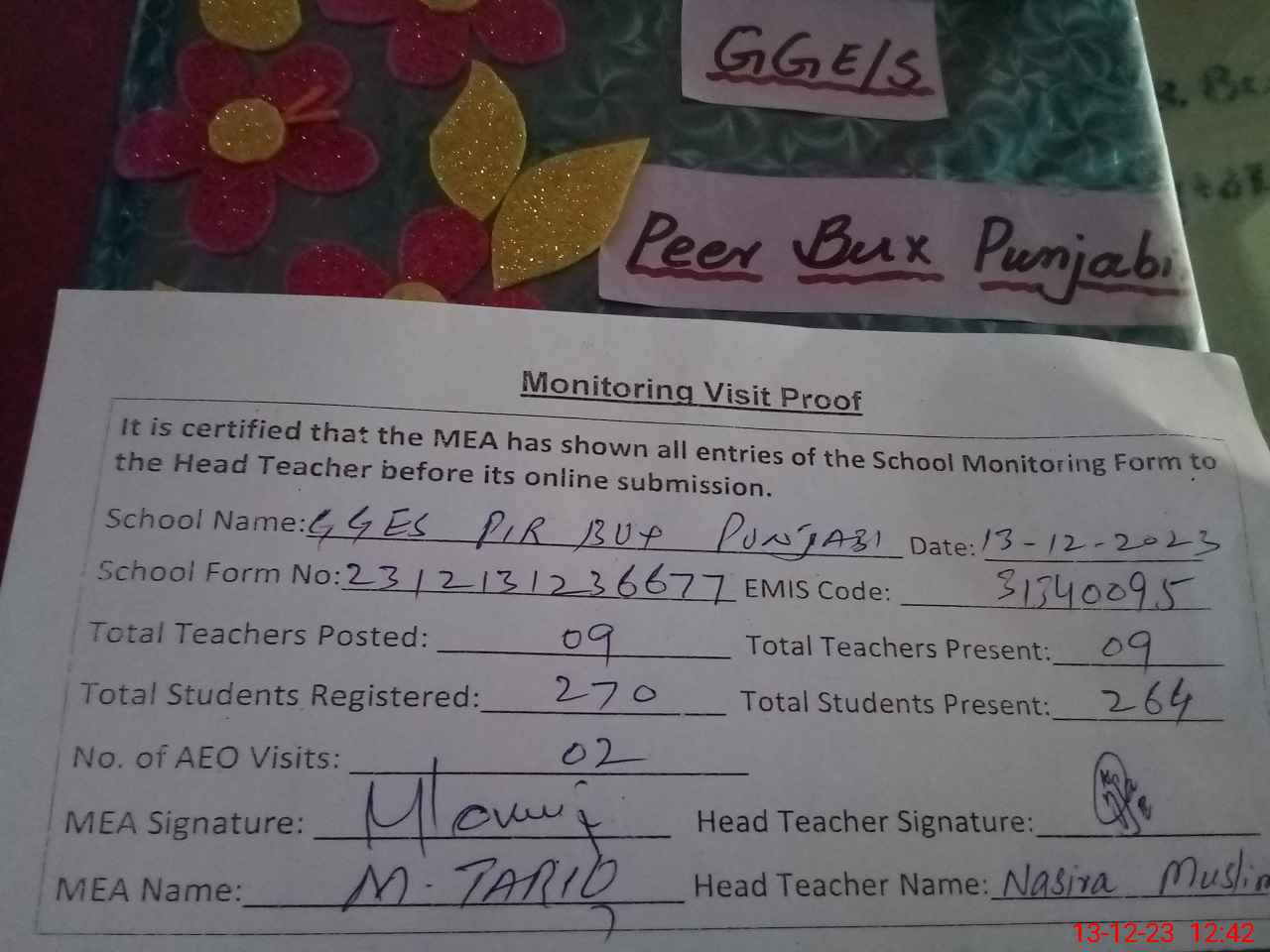 | Attendance Register | Head Teacher | MEA with School | Visit Proof |