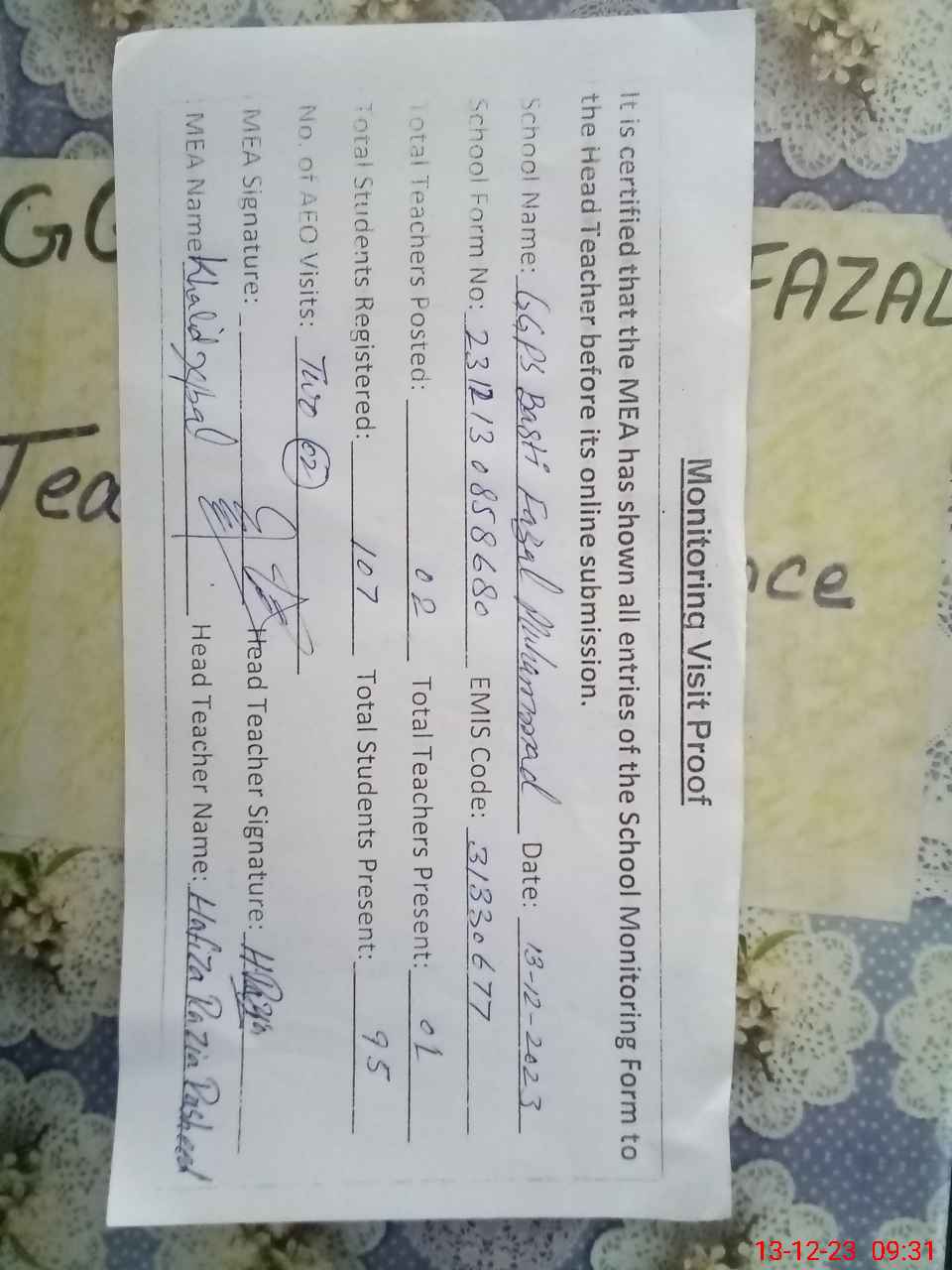 | Attendance Register | Head Teacher | MEA with School | Visit Proof |