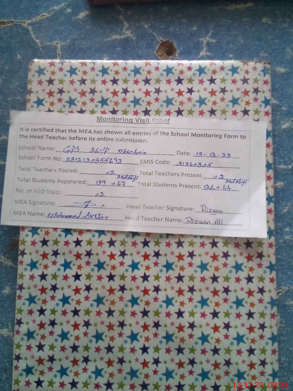 | Attendance Register | Head Teacher | MEA with School | Visit Proof |