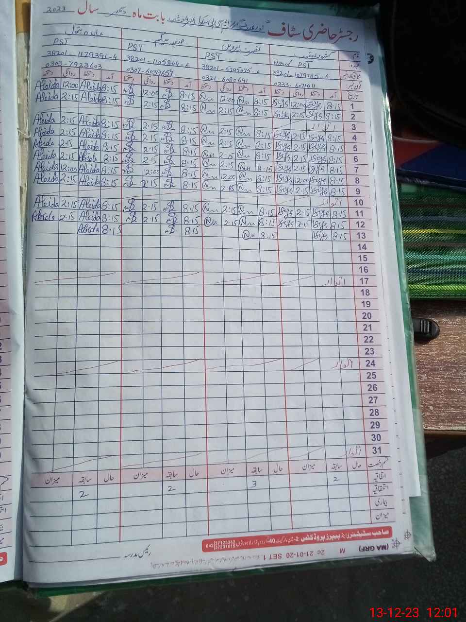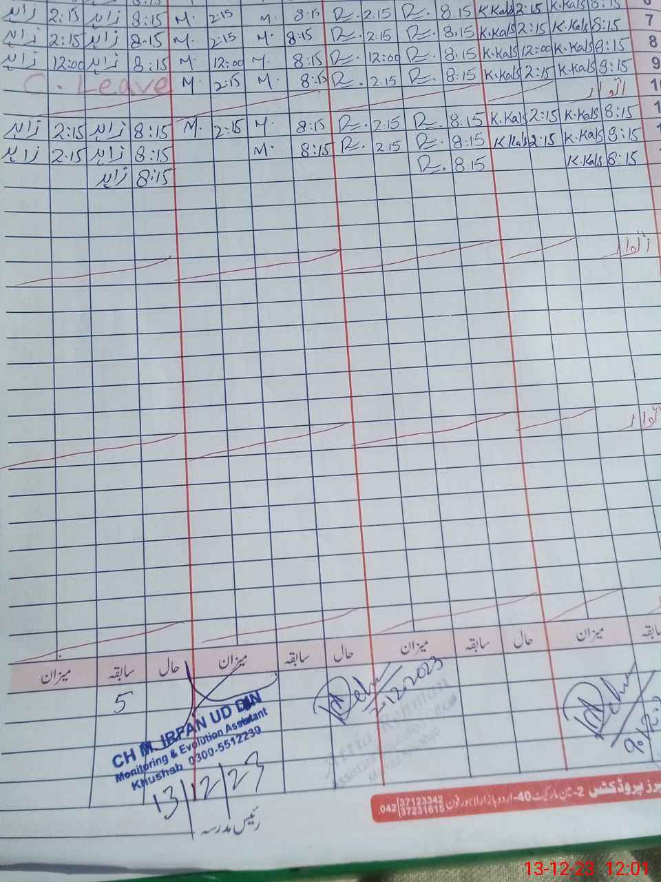 | CNIC | Full Name | Designation | R/C | Absence During Last Calender Month |