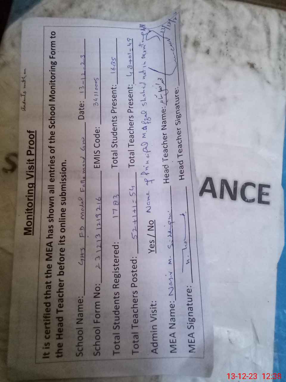| Attendance Register | Head Teacher | MEA with School | Visit Proof |