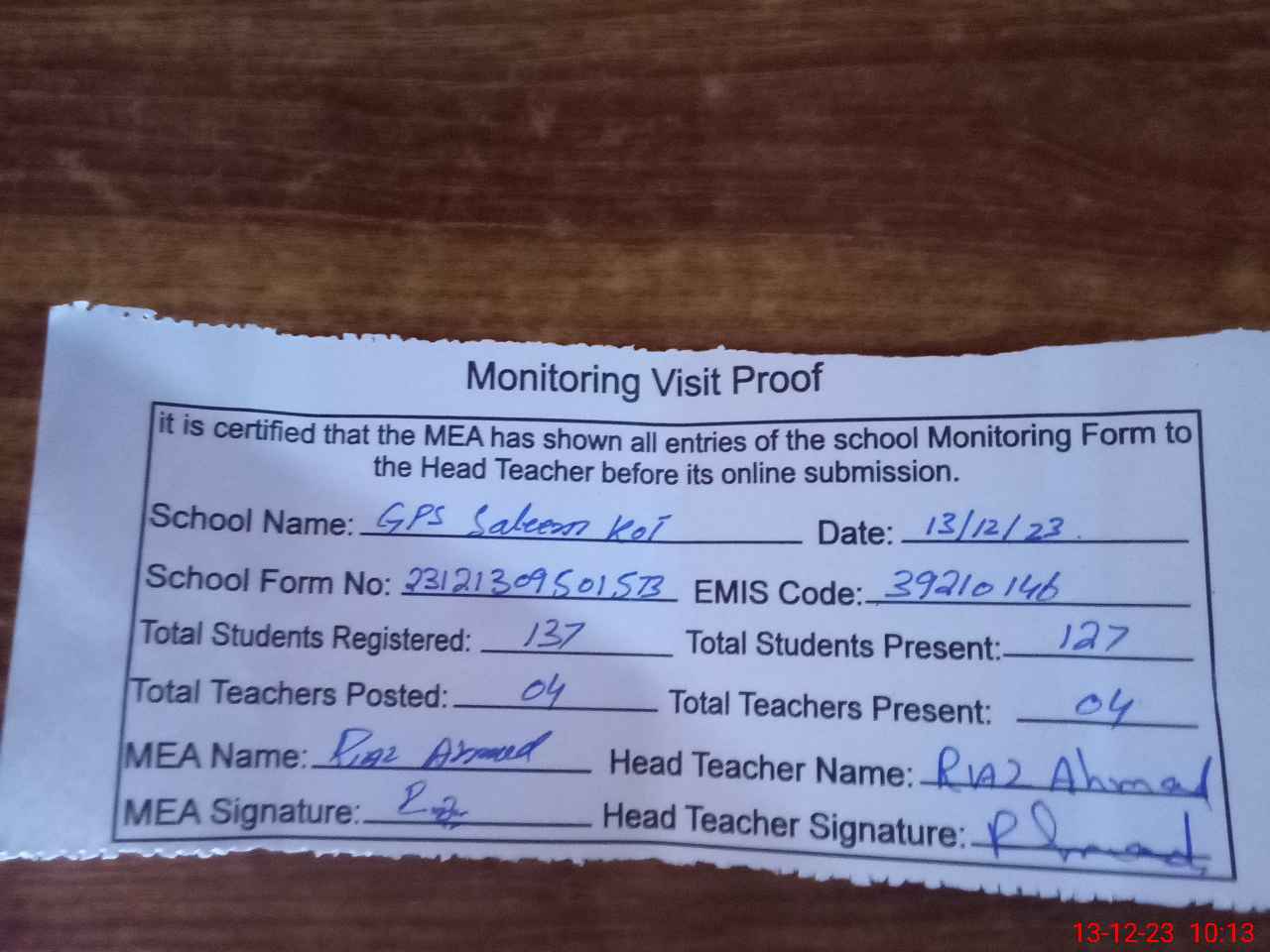 | EMIS Code: 39210146 | Name of School: GPS SALEEM KOT PAKPATTAN | |||
