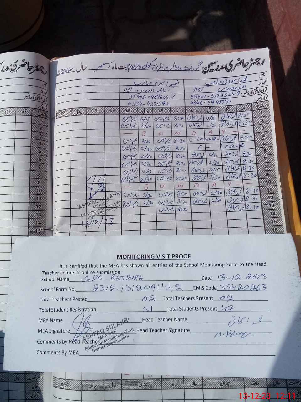 | Attendance Register | Head Teacher | MEA with School | Visit Proof |
