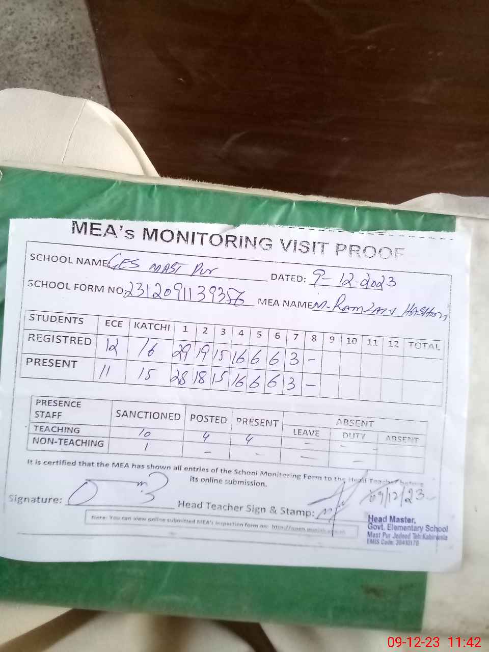 | Attendance Register | Head Teacher | MEA with School | Visit Proof |