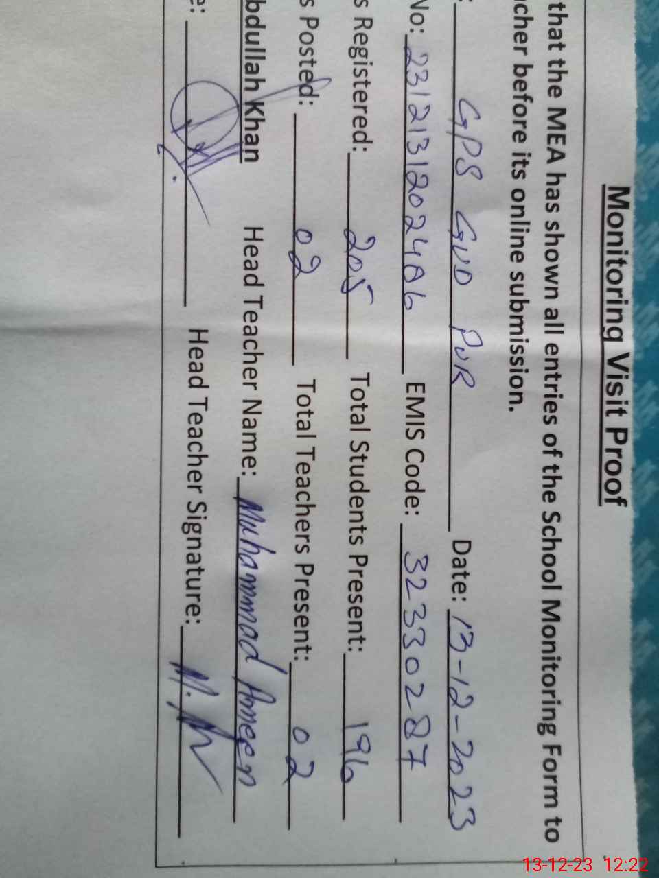 | EMIS Code: 32330287 | Name of School: GPS GUD PUR | |||