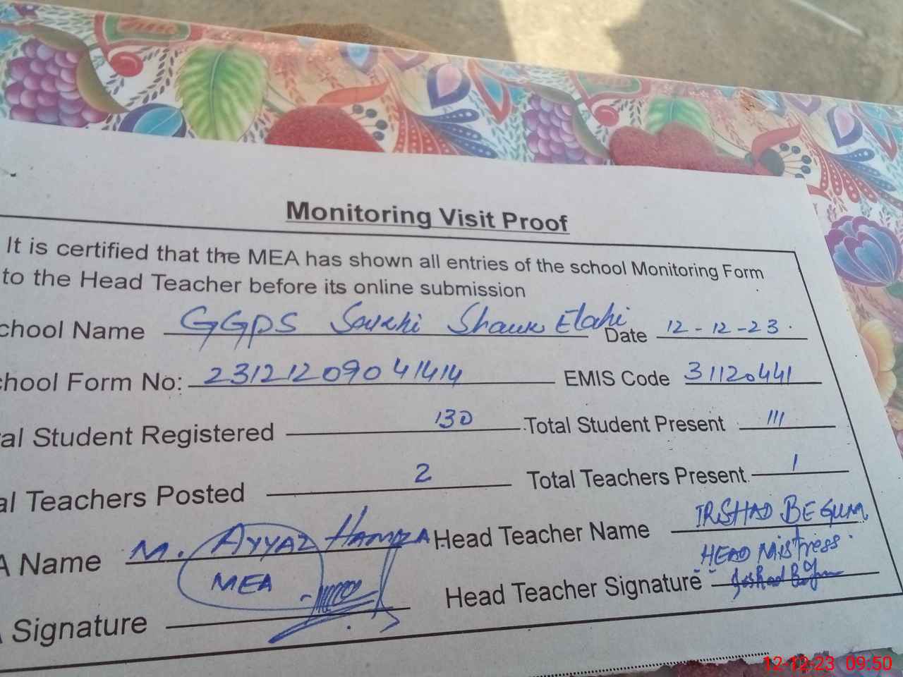 | Attendance Register | Head Teacher | MEA with School | Visit Proof |