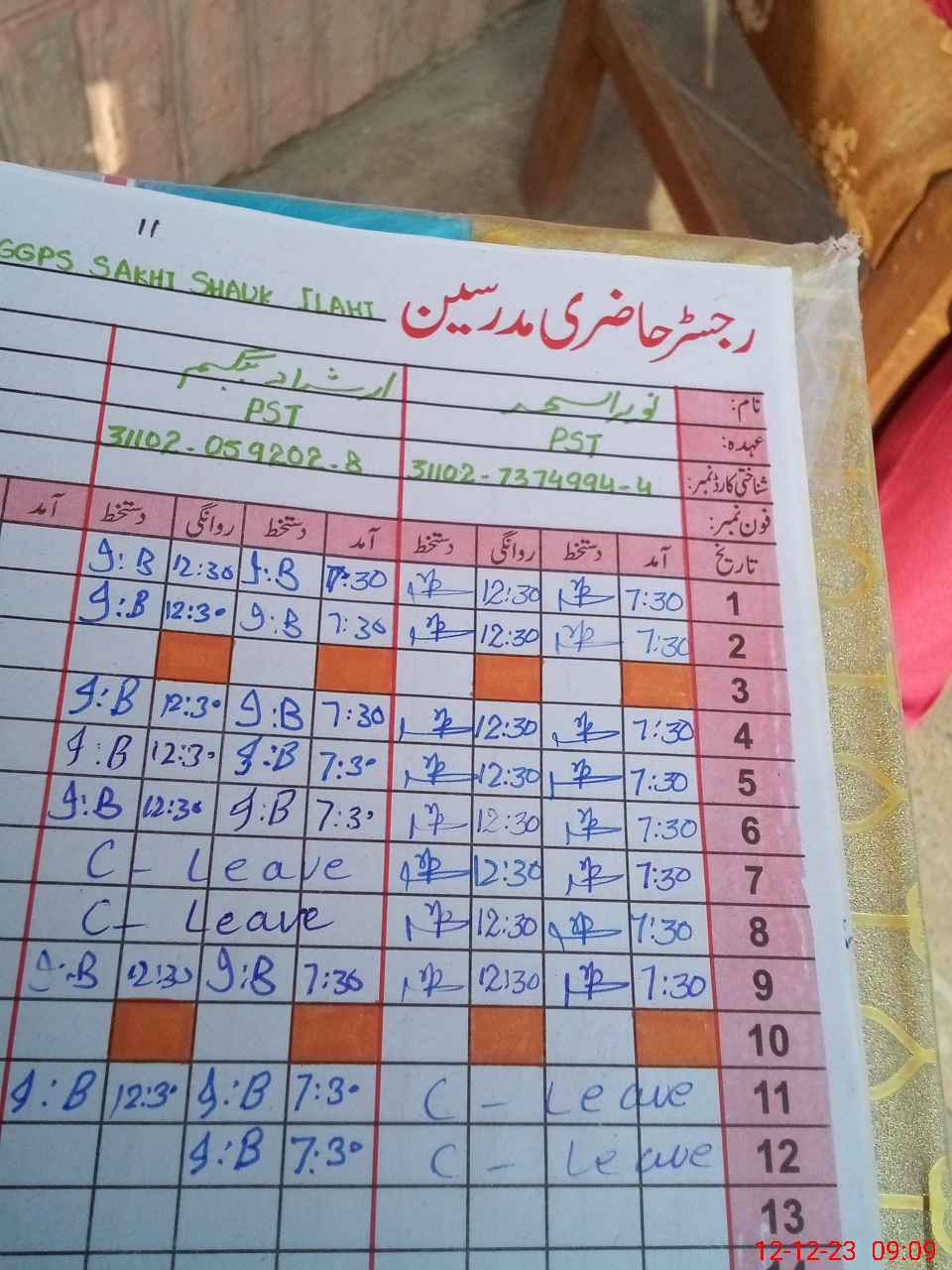| CNIC | Full Name | Designation | R/C | Absence During Last Calender Month |