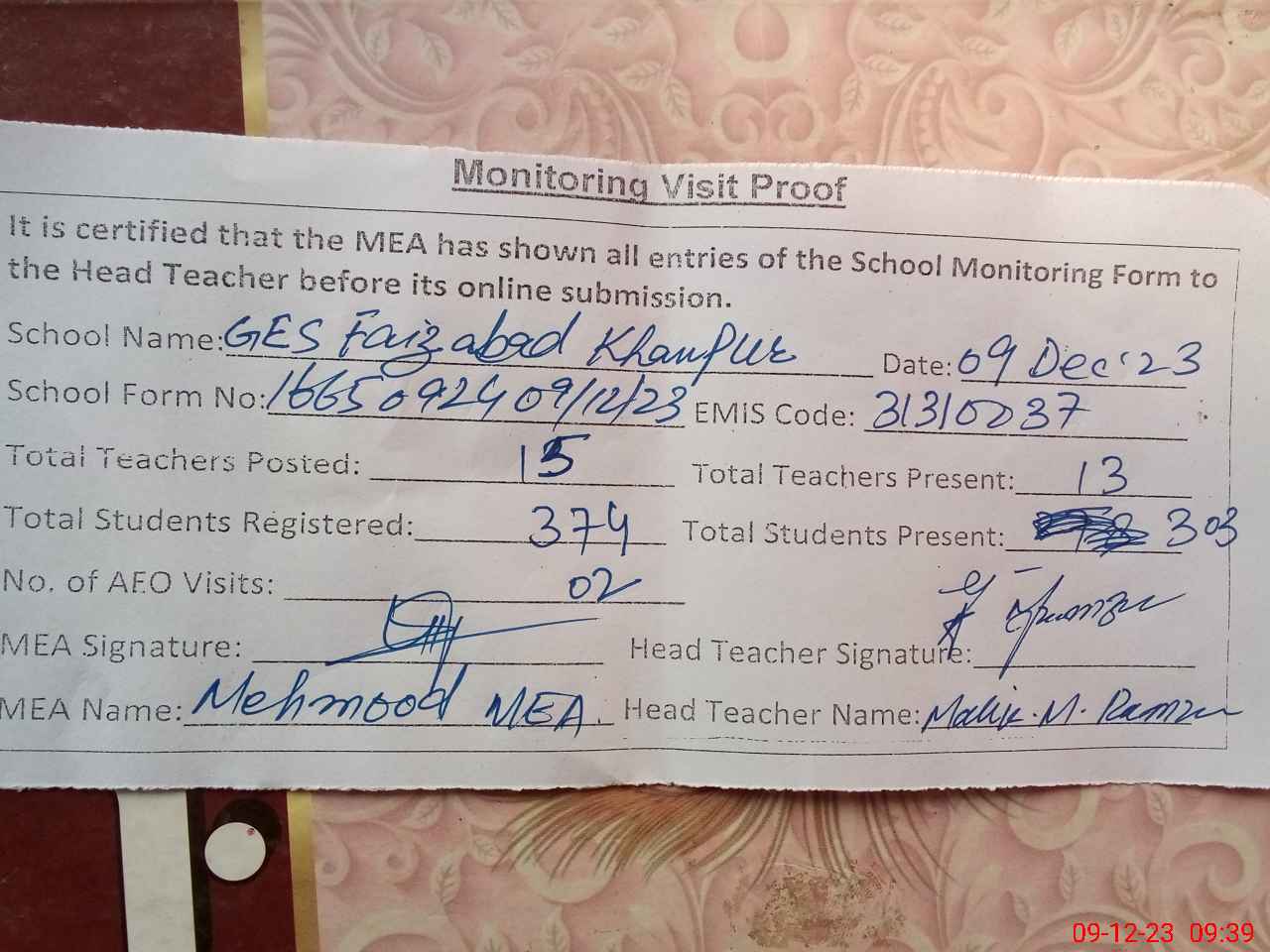 | EMIS Code: 31310037 | Name of School: GES FAIZ ABAD KHANPUR | |||
