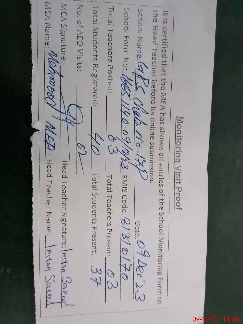 | Attendance Register | Head Teacher | MEA with School | Visit Proof |