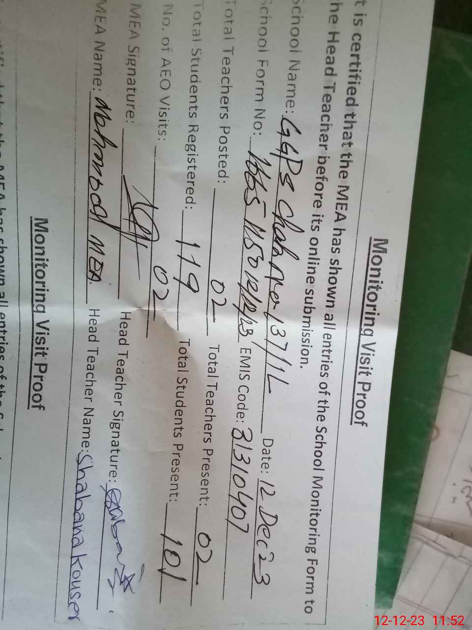 | Attendance Register | Head Teacher | MEA with School | Visit Proof |