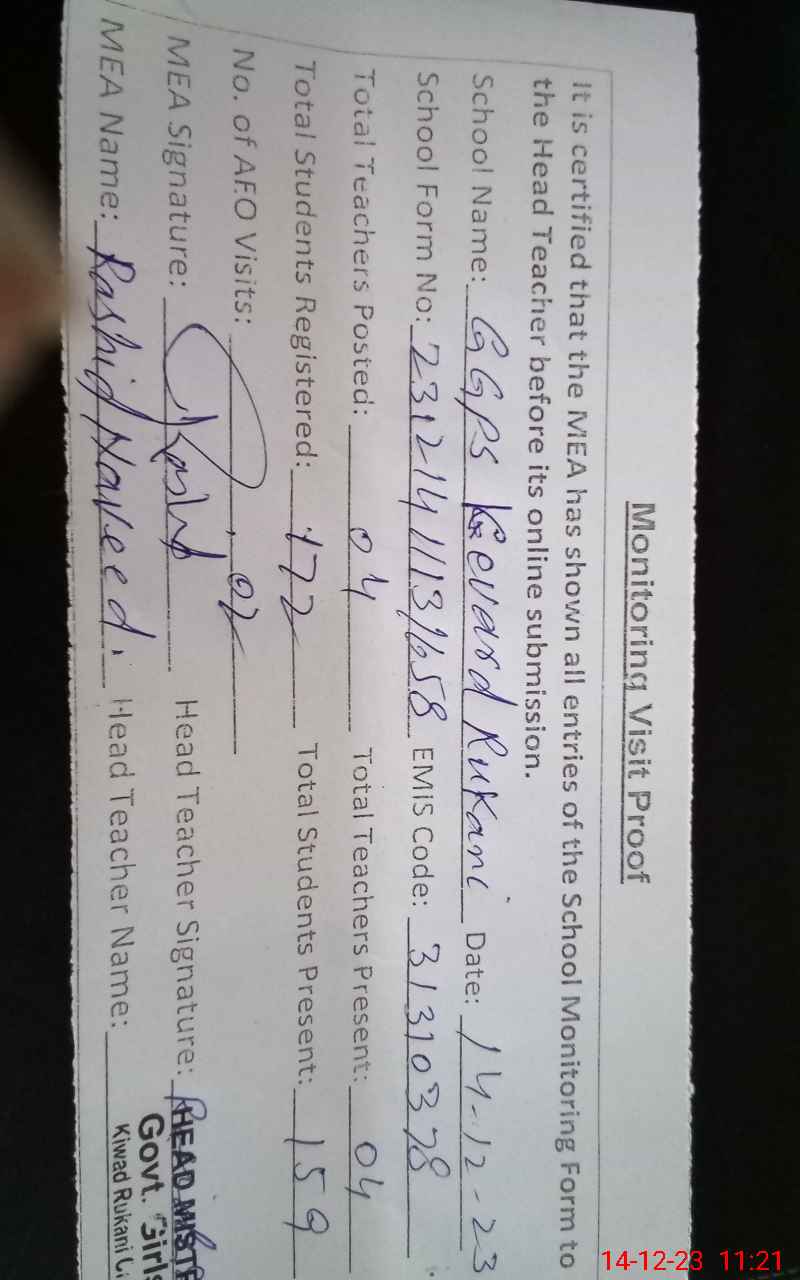 | Attendance Register | Head Teacher | MEA with School | Visit Proof |