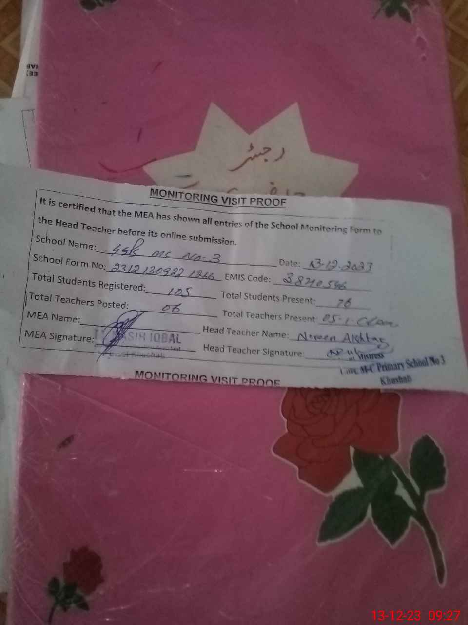 | Attendance Register | Head Teacher | MEA with School | Visit Proof |