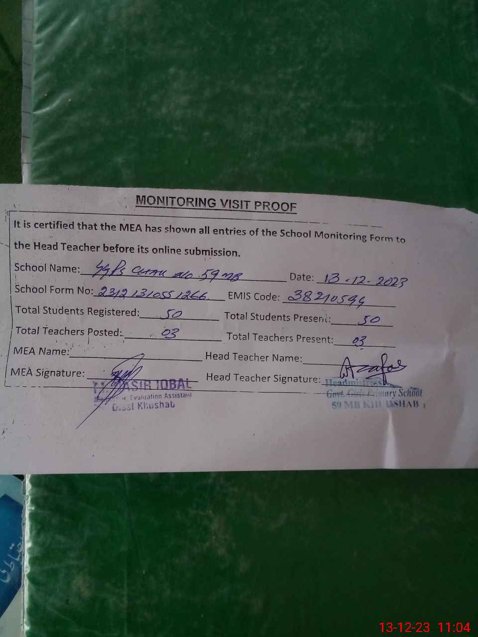 | Attendance Register | Head Teacher | MEA with School | Visit Proof |