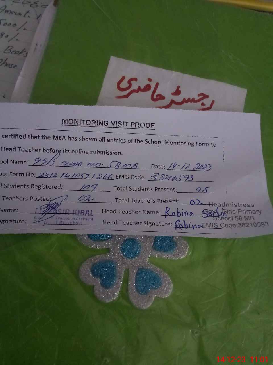 | EMIS Code: 38210593 | Name of School: GGPS CHAK NO. 58 MB | |||