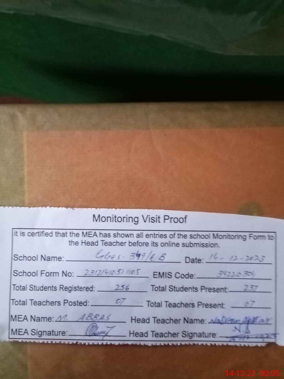 | EMIS Code: 39220304 | Name of School: GGES 349 EB POST OFFICE chak 157/EB | |||