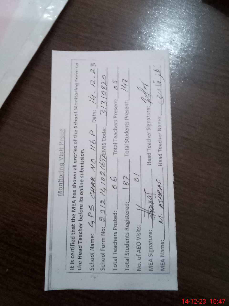 | Attendance Register | Head Teacher | MEA with School | Visit Proof |