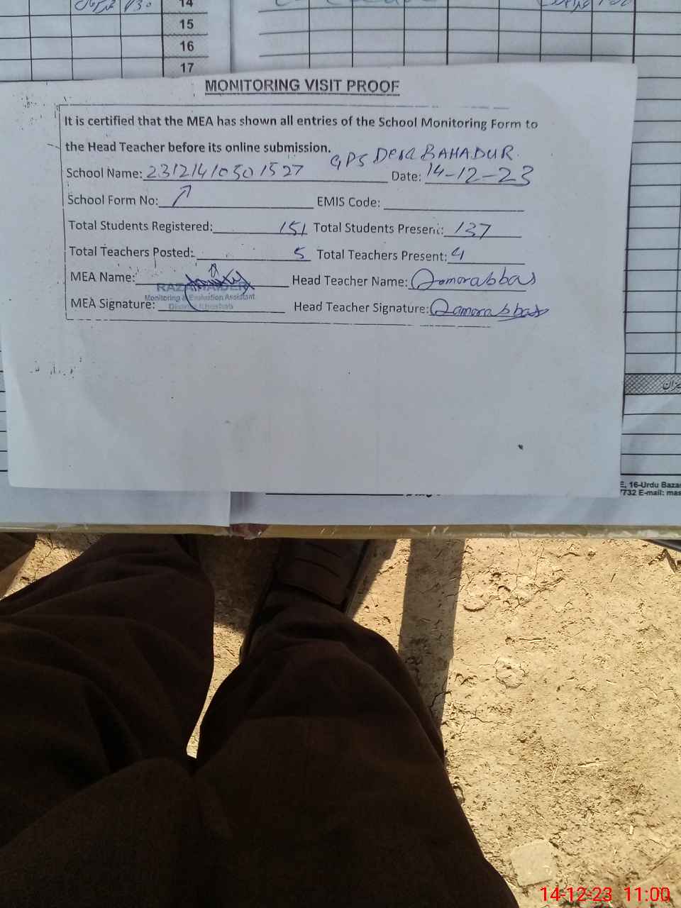 | Attendance Register | Head Teacher | MEA with School | Visit Proof |