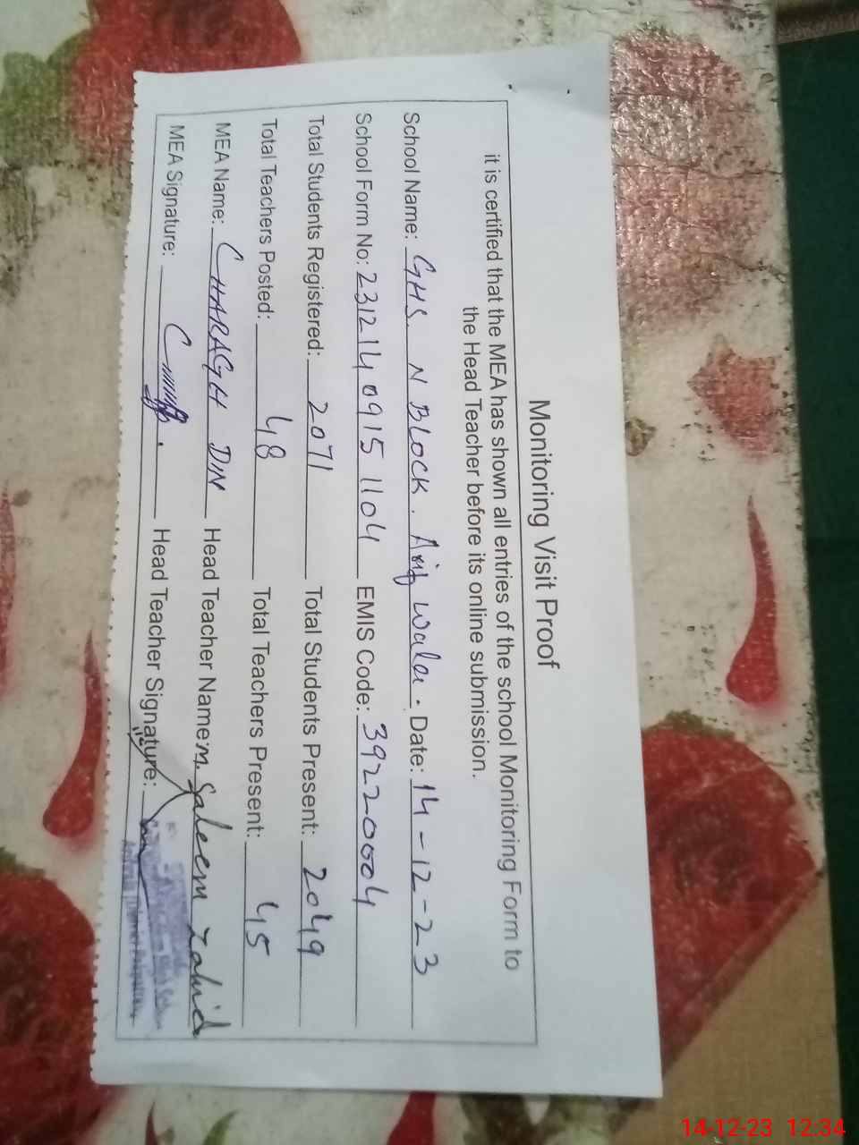 | EMIS Code: 39220004 | Name of School: GHS ARIFWALA N BLOCK | |||