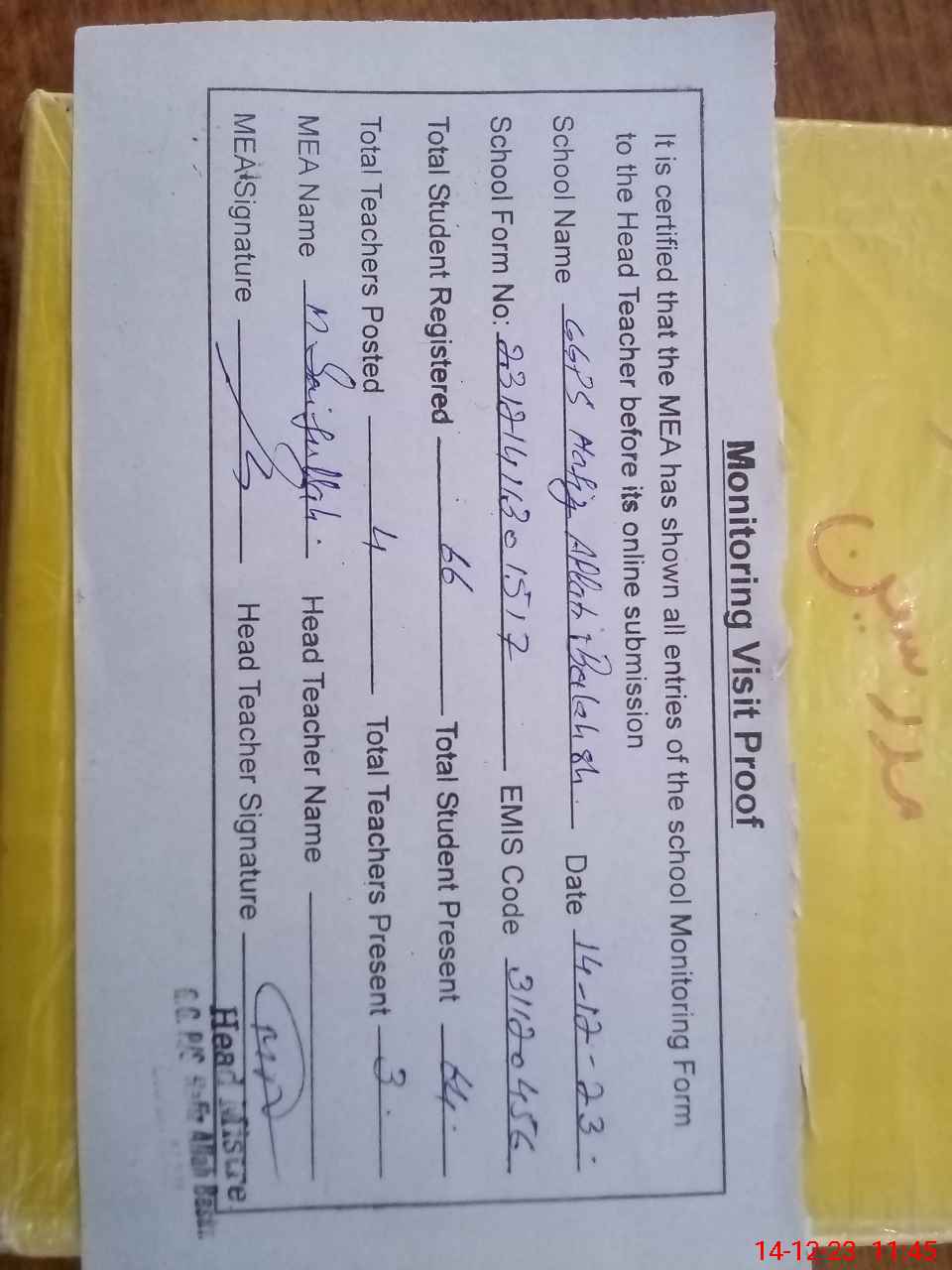 | Attendance Register | Head Teacher | MEA with School | Visit Proof |