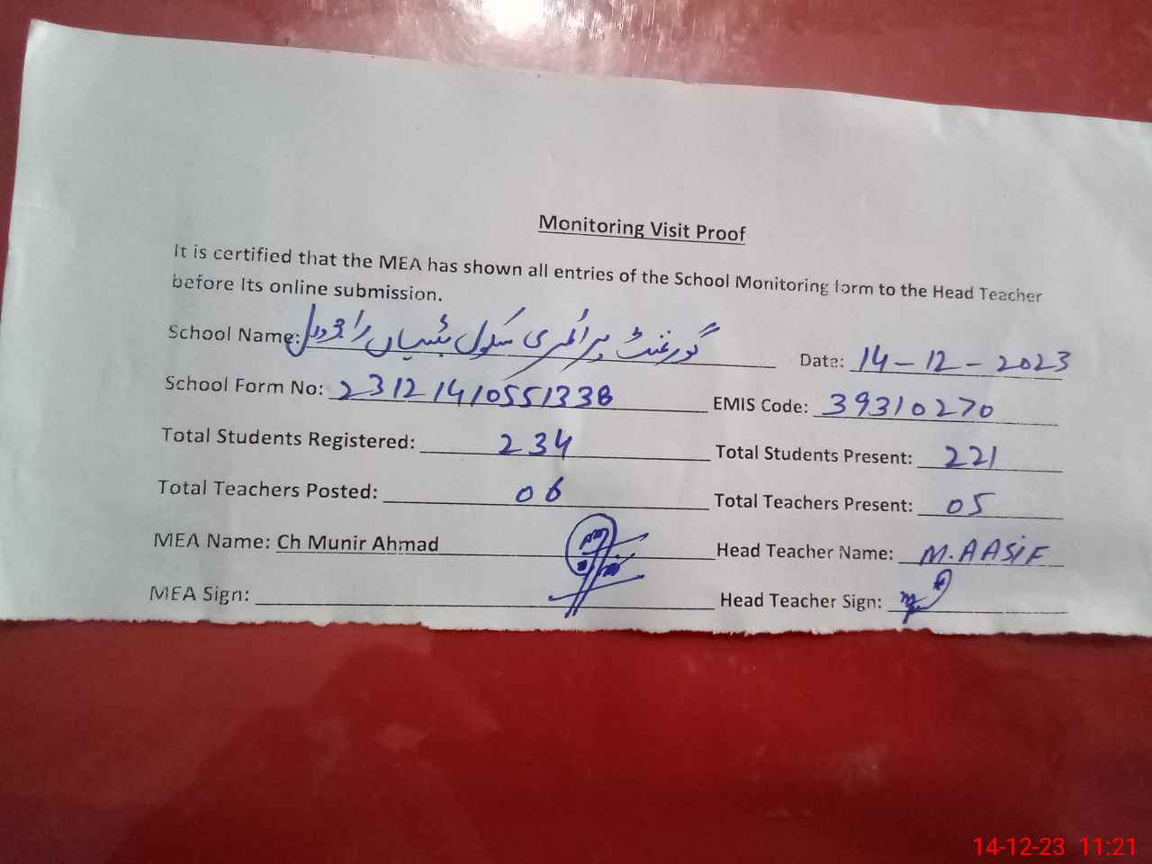 | Attendance Register | Head Teacher | MEA with School | Visit Proof |