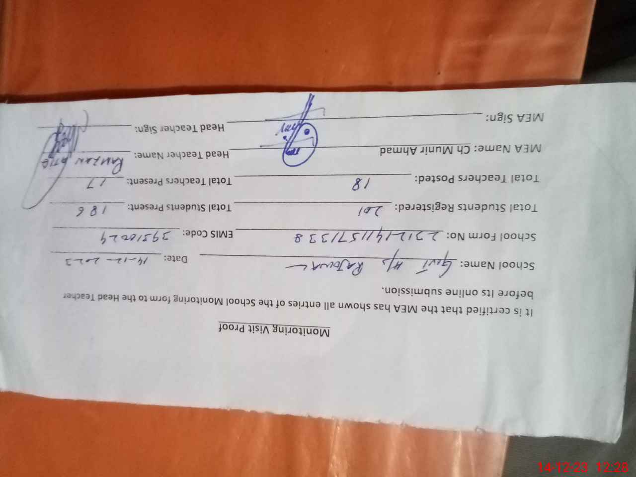 | Attendance Register | Head Teacher | MEA with School | Visit Proof |