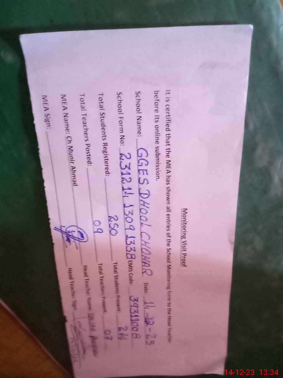 | EMIS Code: 39311008 | Name of School: GGES DHOOL CHOHAR | |||