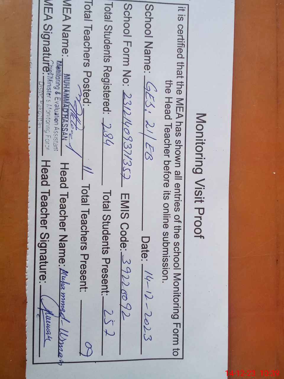| Attendance Register | Head Teacher | MEA with School | Visit Proof |