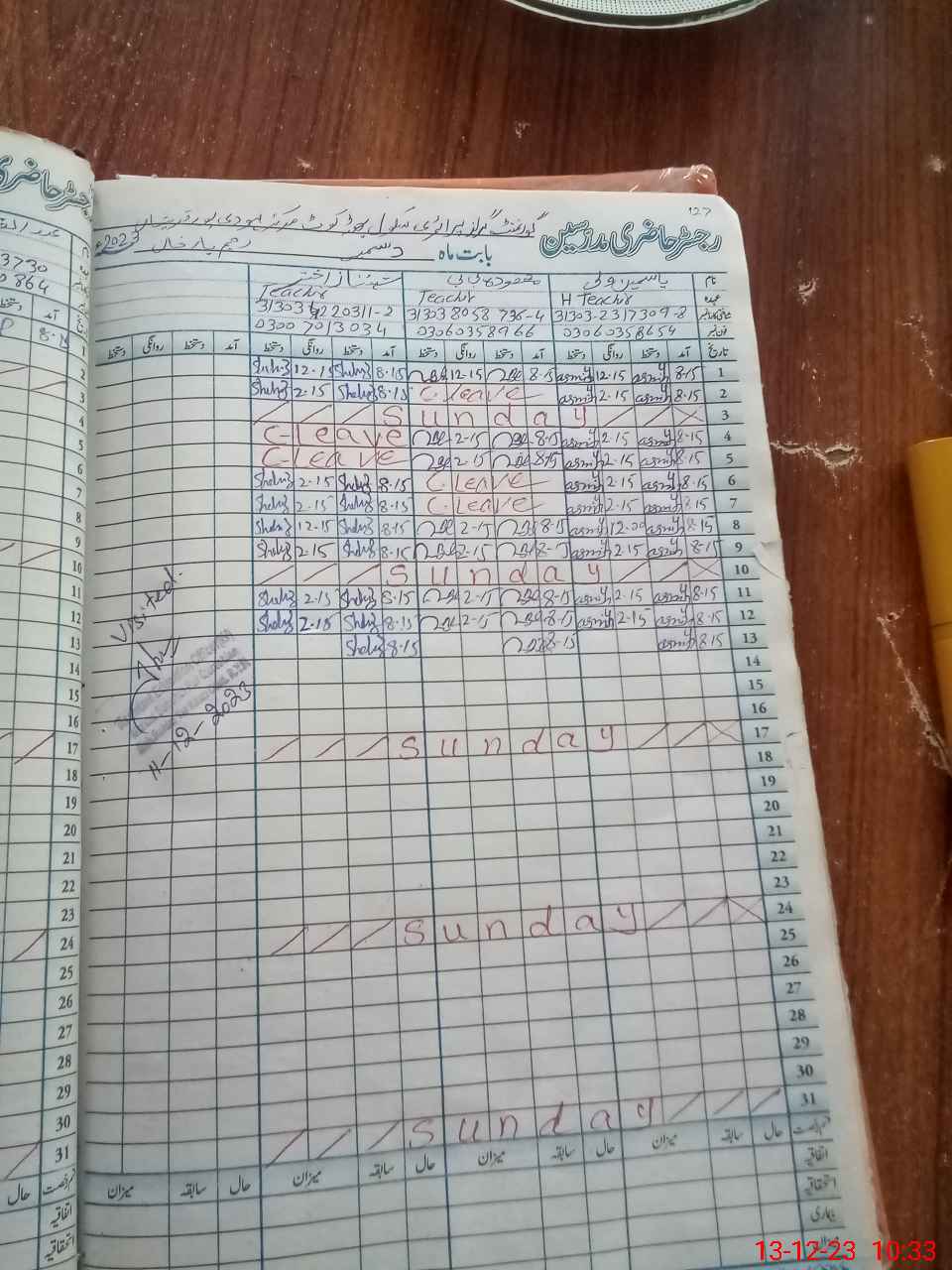 | CNIC | Full Name | Designation | R/C | Absence During Last Calender Month |