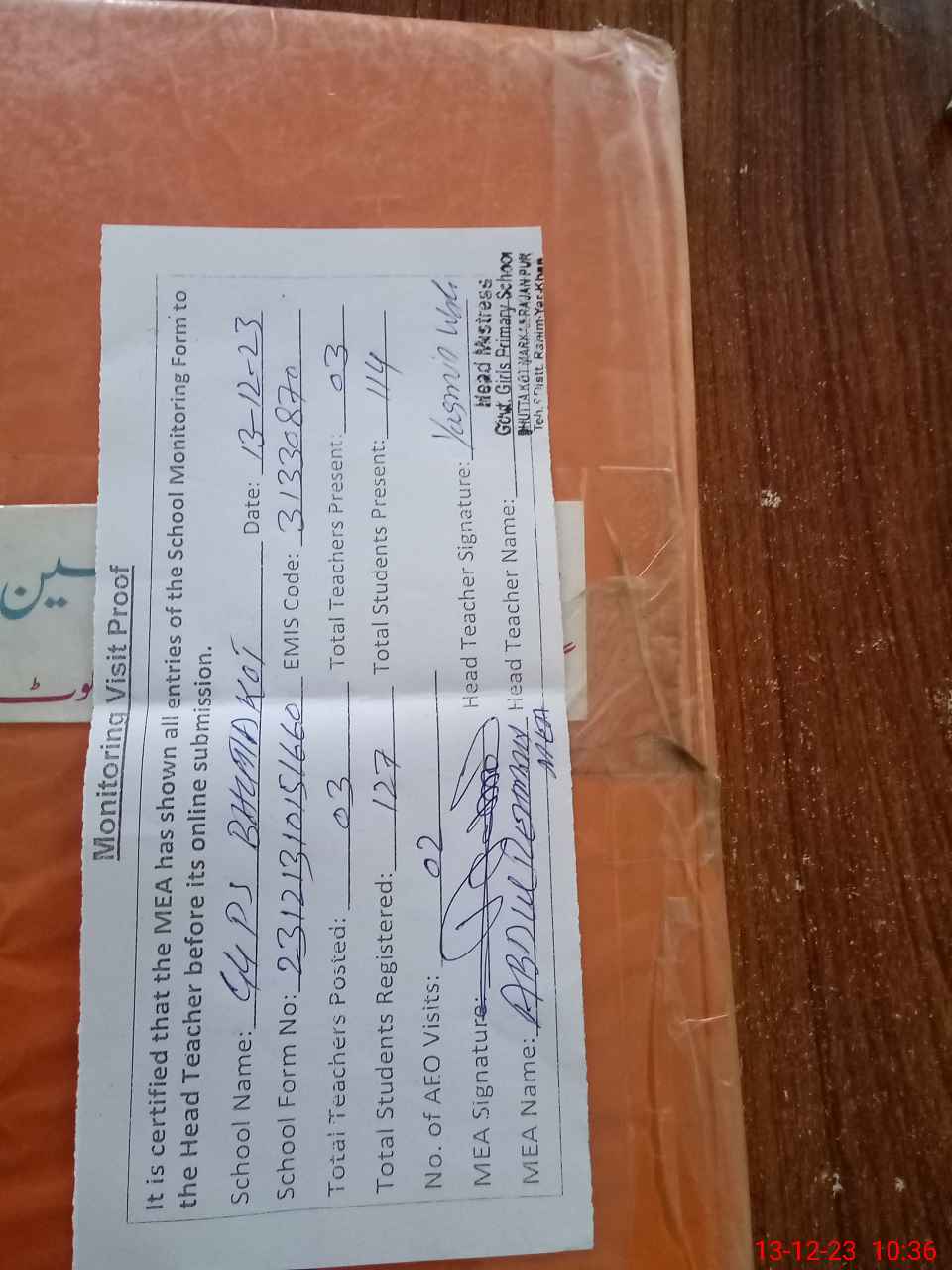 | Attendance Register | Head Teacher | MEA with School | Visit Proof |