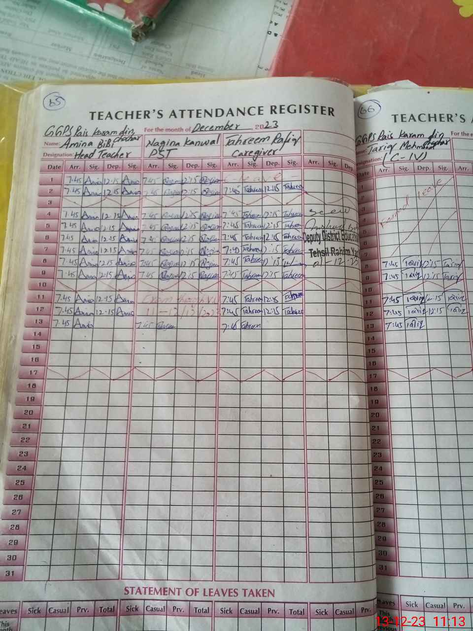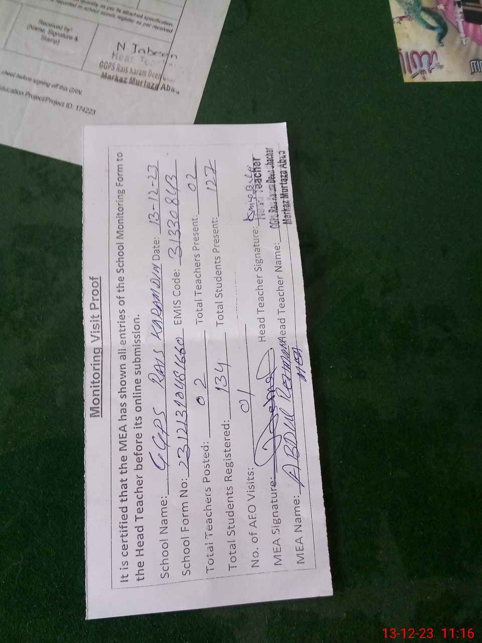 | Attendance Register | Head Teacher | MEA with School | Visit Proof |