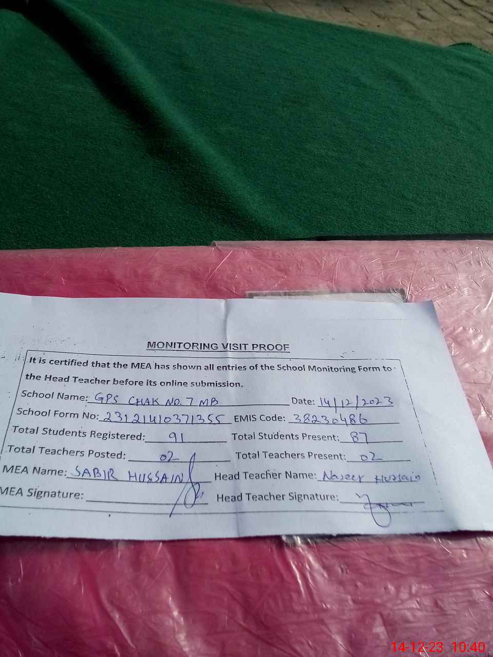 | EMIS Code: 38230486 | Name of School: GPS CHAK NO. 7 MB | |||