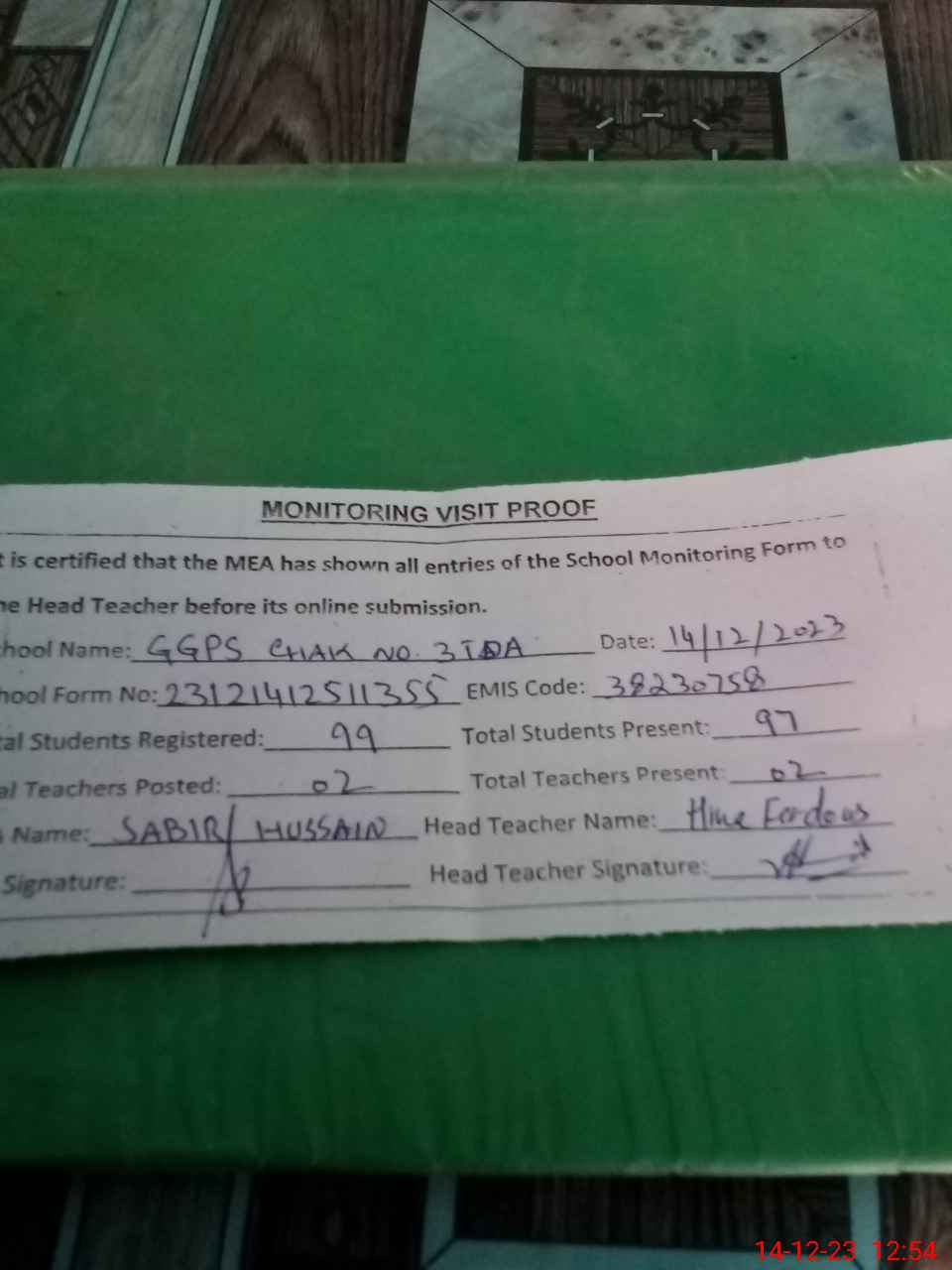 | Attendance Register | Head Teacher | MEA with School | Visit Proof |