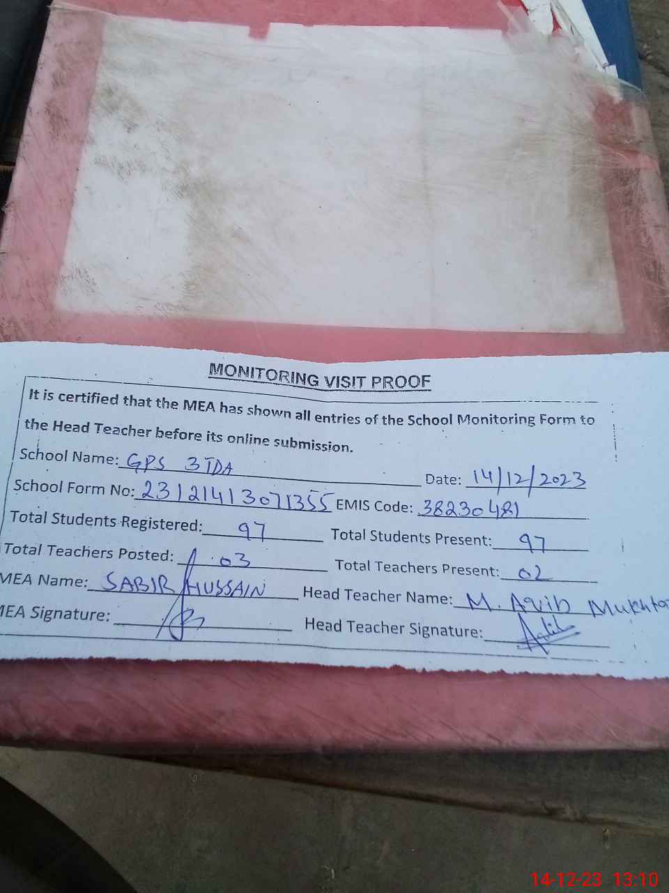| Attendance Register | Head Teacher | MEA with School | Visit Proof |