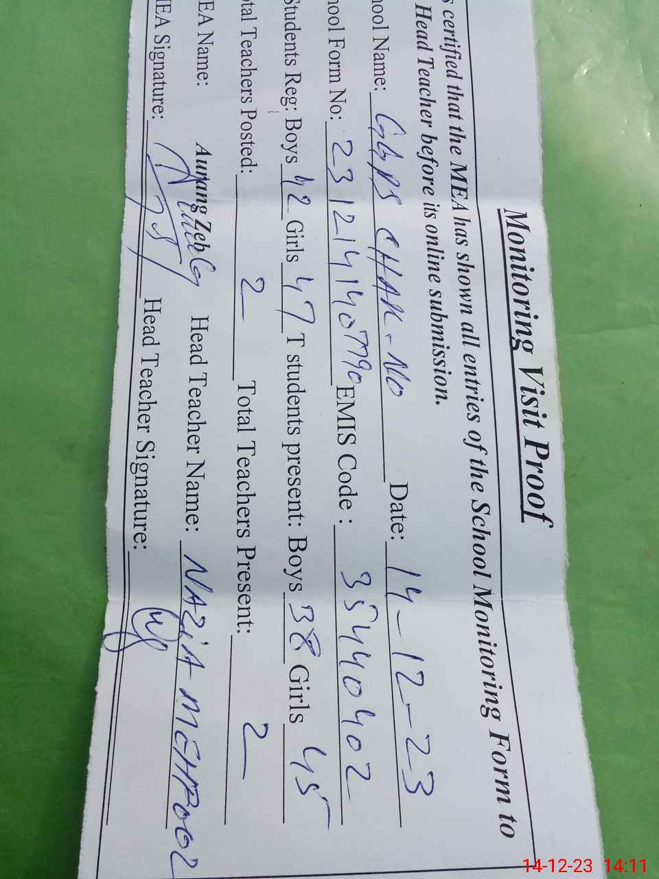 | Attendance Register | Head Teacher | MEA with School | Visit Proof |