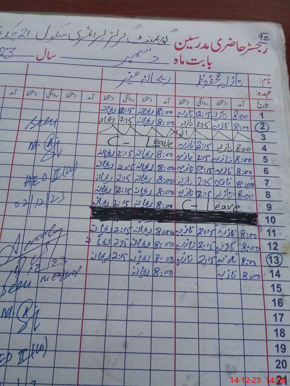 | CNIC | Full Name | Designation | R/C | Absence During Last Calender Month |