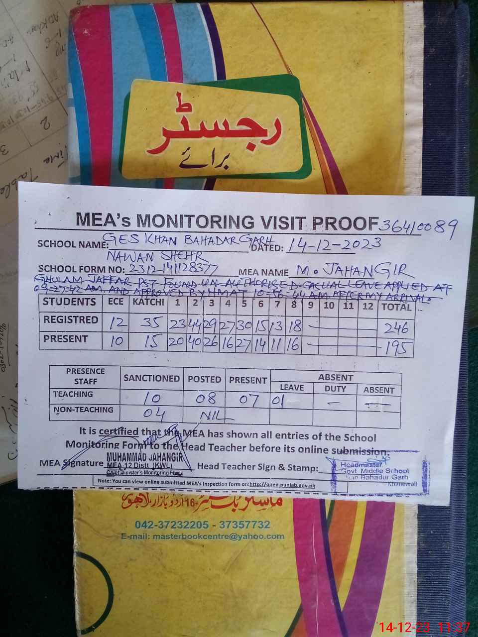 | EMIS Code: 36410089 | Name of School: GES KHAN BAHADUR GARH, NAWAN SHEHR | |||