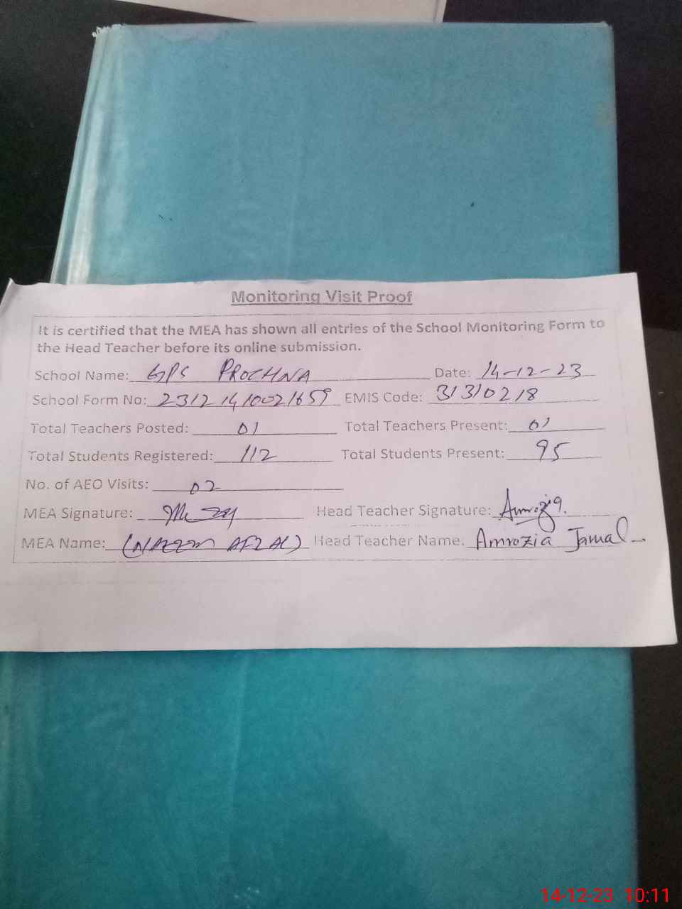 | Attendance Register | Head Teacher | MEA with School | Visit Proof |
