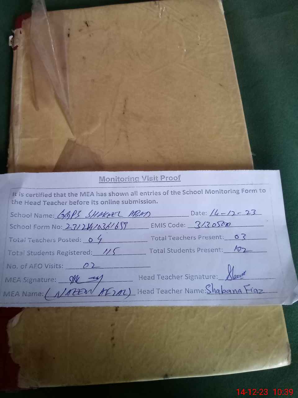 | Attendance Register | Head Teacher | MEA with School | Visit Proof |