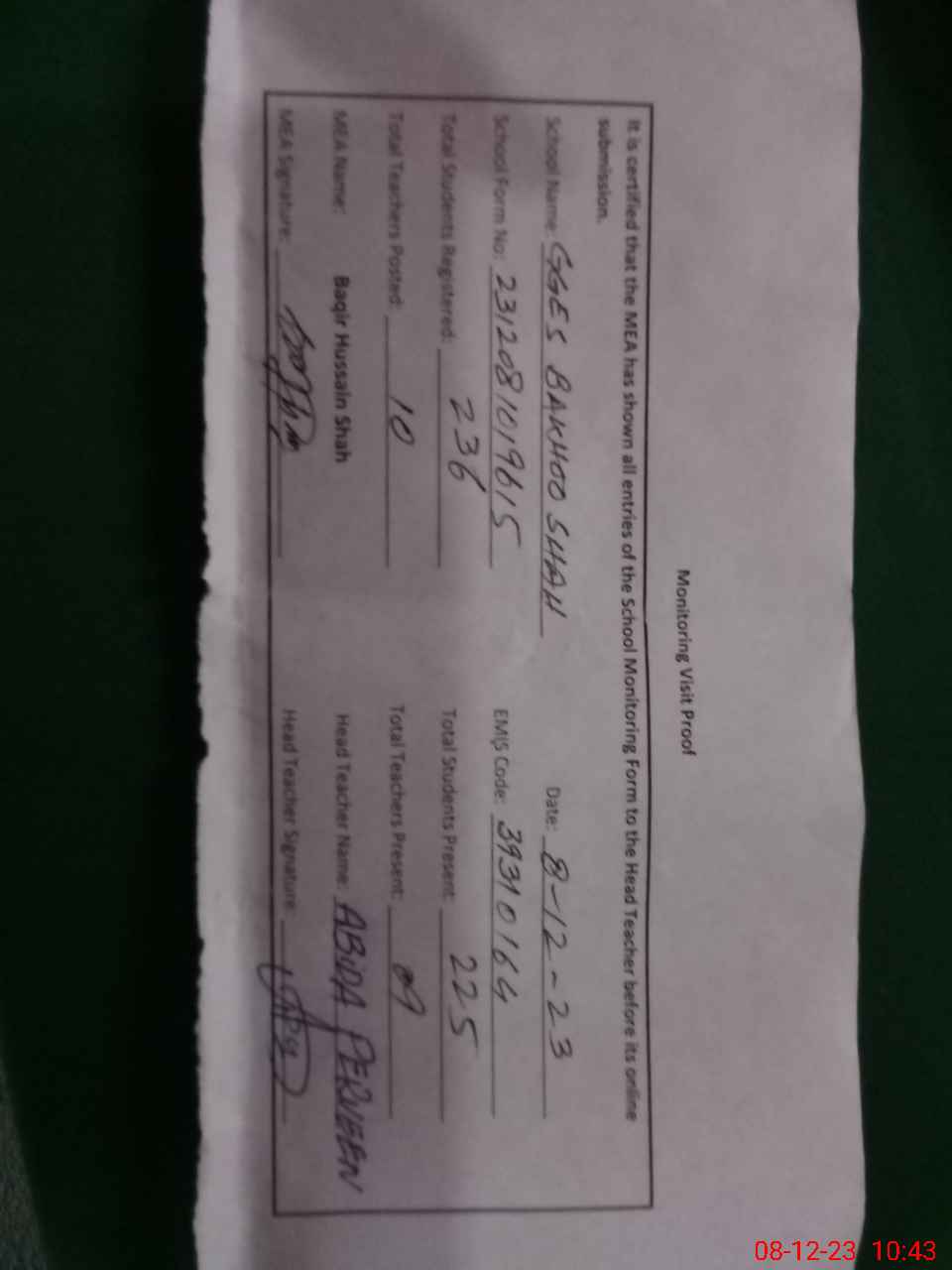 | Certified that this School was Inspected by the Undersigned MEA/DMO Today and the Information Stated Above is as Per Record. | |||||