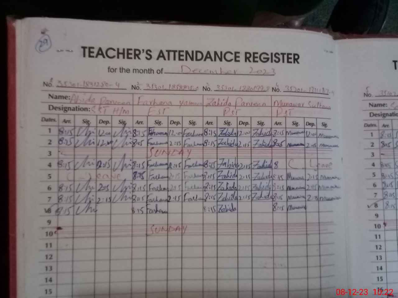 | CNIC | Full Name | Designation | R/C | Absence During Last Calender Month |