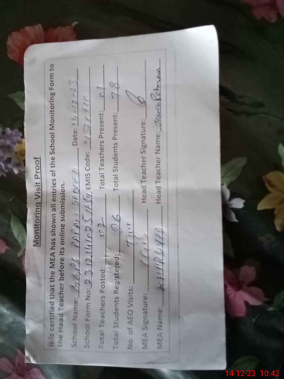 | Attendance Register | Head Teacher | MEA with School | Visit Proof |